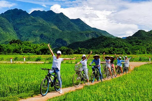 Buổi chiều: quý khách khám phá thung lũng Mai Châu bằng xe đạp, thăm những ngôi nhà sàn nhỏ xinh của người Thái để tìm hiểu những nét văn hóa độc đáo của họ, tới thăm những gian hàng thổ cẩm, cùng tìm hiểu cách dệt thổ cẩm của người Thái và mua những món quà lưu niệm nơi đây.